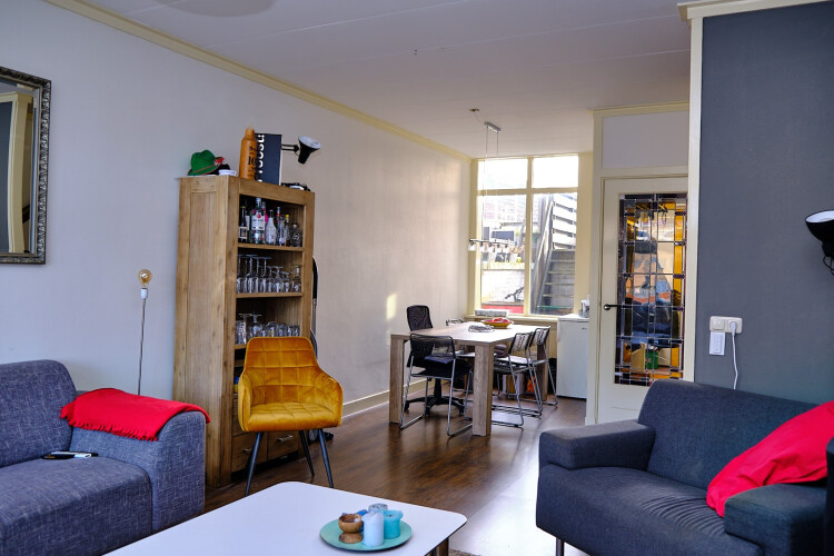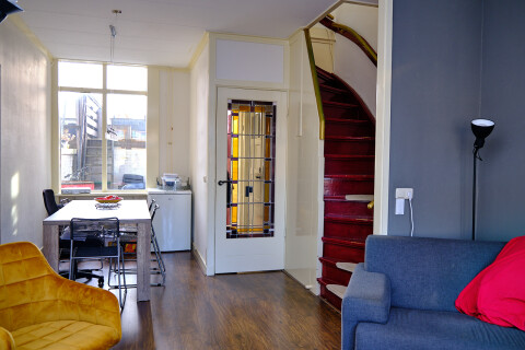Vanaf de Kanaalkade stap je zo de hal binnen en via een trap, met opslagruimte eronder, loop je naar de eerste verdieping. Hier vind je de woonkamer, keuken, deur richting het dakterras en het toilet. Vanuit de woonkamer heb je een prima uitzicht over het kanaal maar door het stevige kozijn heb je weinig last van het verkeer. Via de trap in de woonkamer kom je bij de slaapkamers, waarvan de te huren privé kamer, en de badkamer.